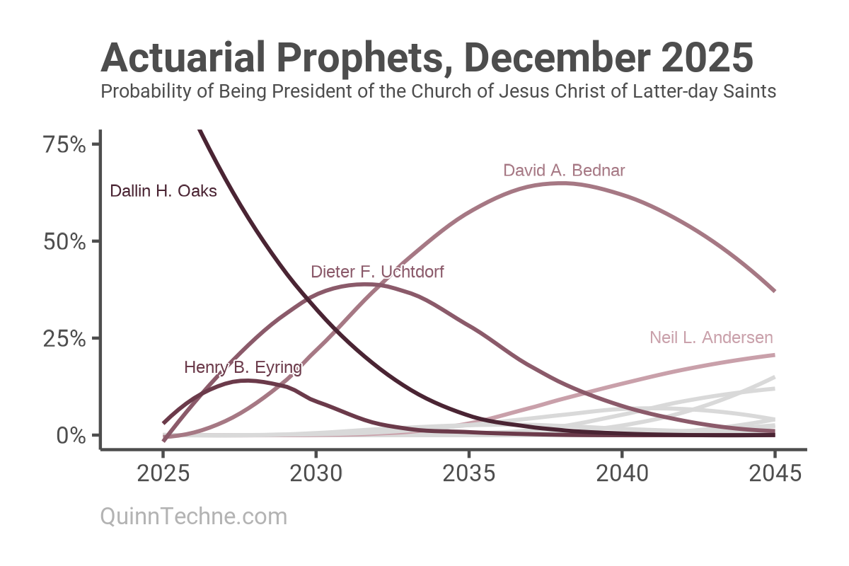 Updated: December 27, 2025. The chart below is updated from October after the death of Elder Holland. The largest upward change is for Elder Uchtdorf, now third in line for succession and about seven years younger than Elder Eyring.