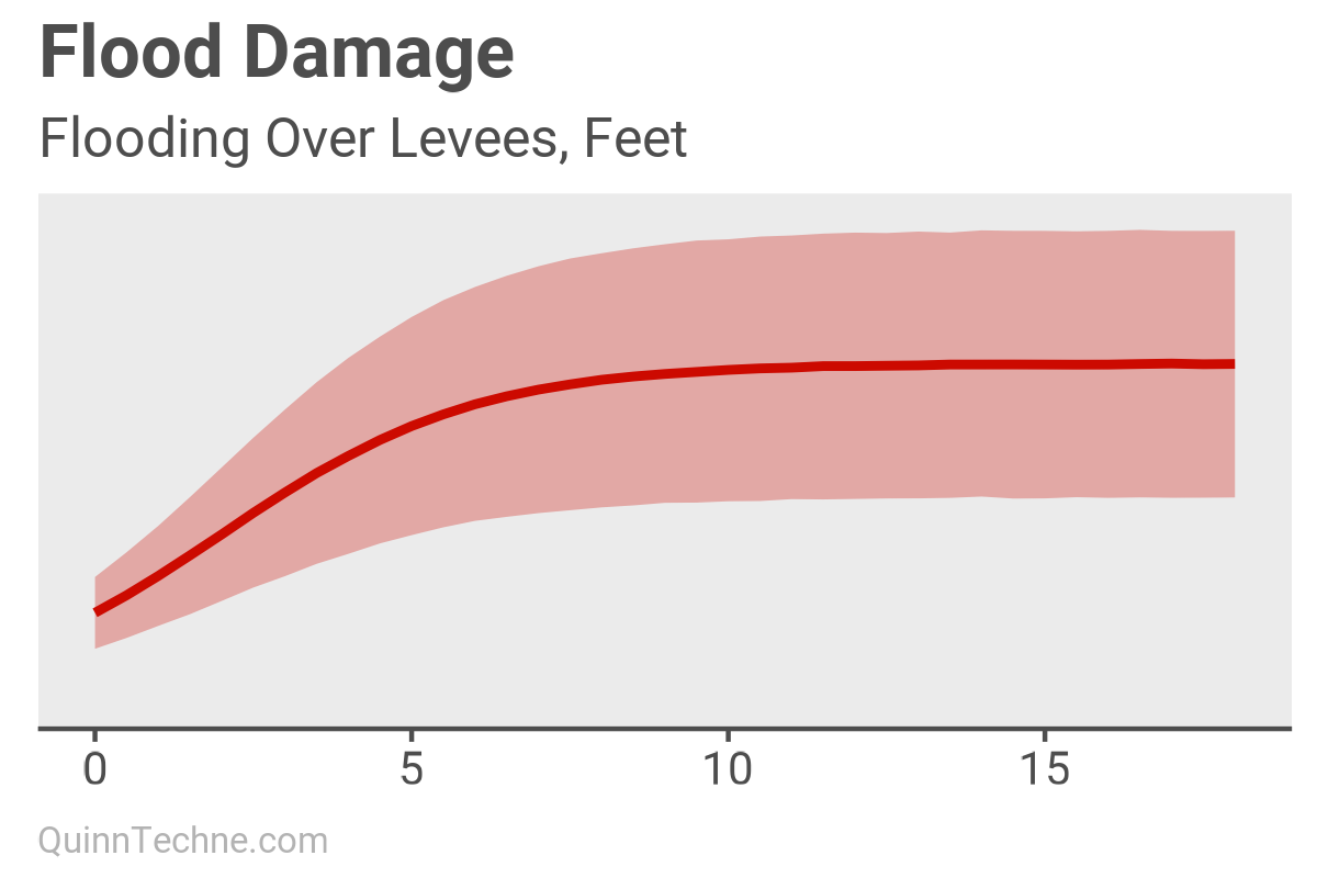 For example, suppose the decisions facing Grand Forks in 1997 were to bolster the levees' height by some height of sandbags. First, you could calculate each decision's outcome: the probability and associated damage of the flood cresting over the levees. Last, you map utility to each outcome. In this case, the utility calculation might be flood damaged in dollars versus the cost of time, labor, and supplies to bolster the levees. Here is an example with mock data.